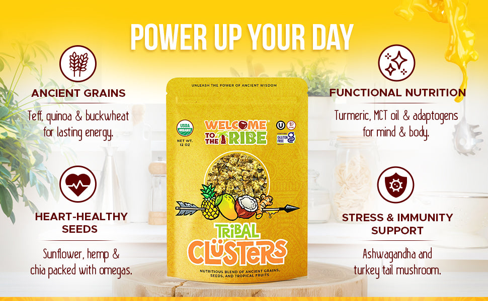 Introducing Tribal Clusters, a gluten-free granola powered with adaptogens and ancient grains for optimum function. Experience the benefits of incorporating ancient wisdom into your daily routine. Each 12 oz bag is packed with functional ingredients for a nutritious and delicious snack.
